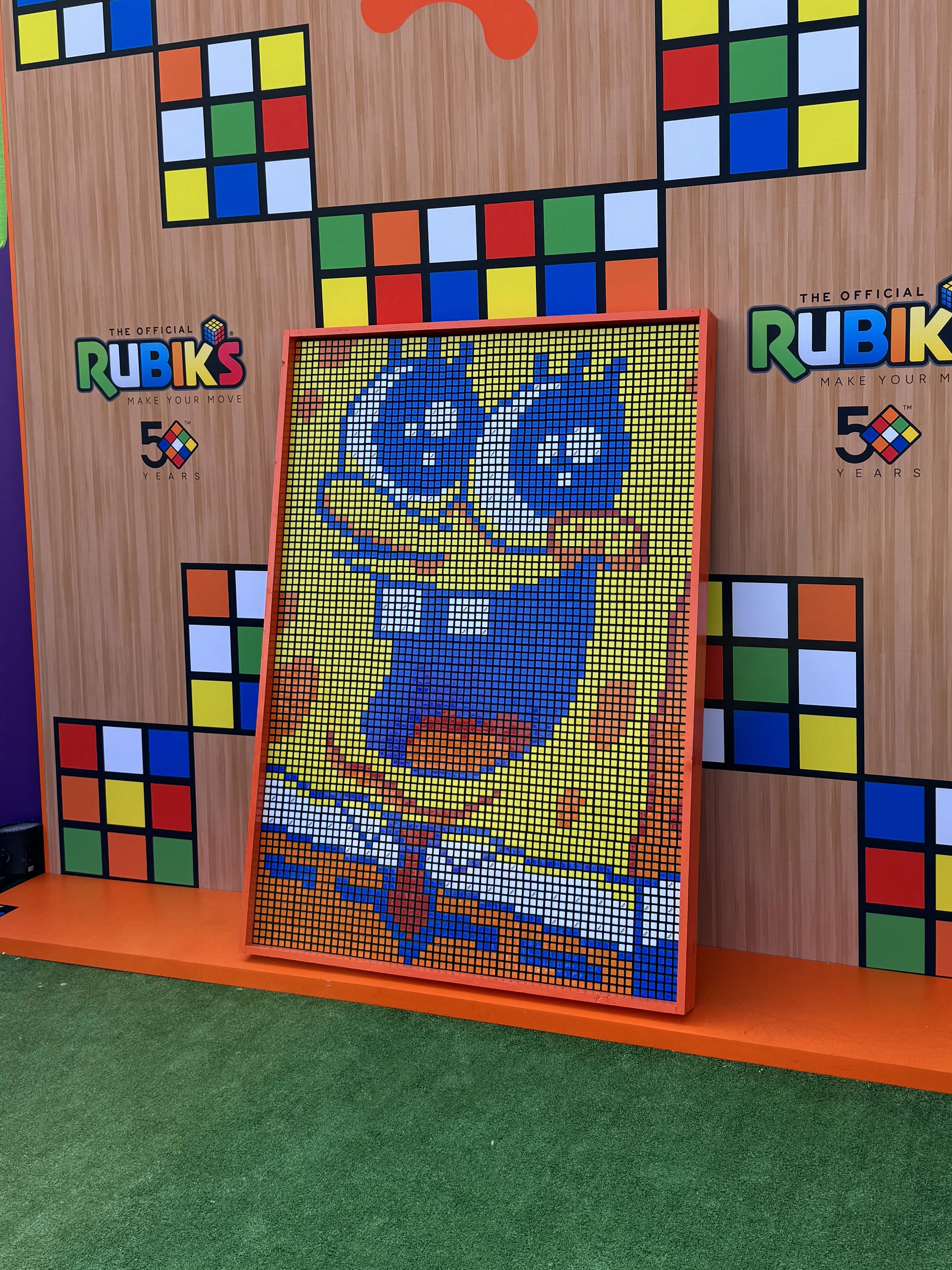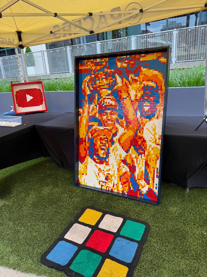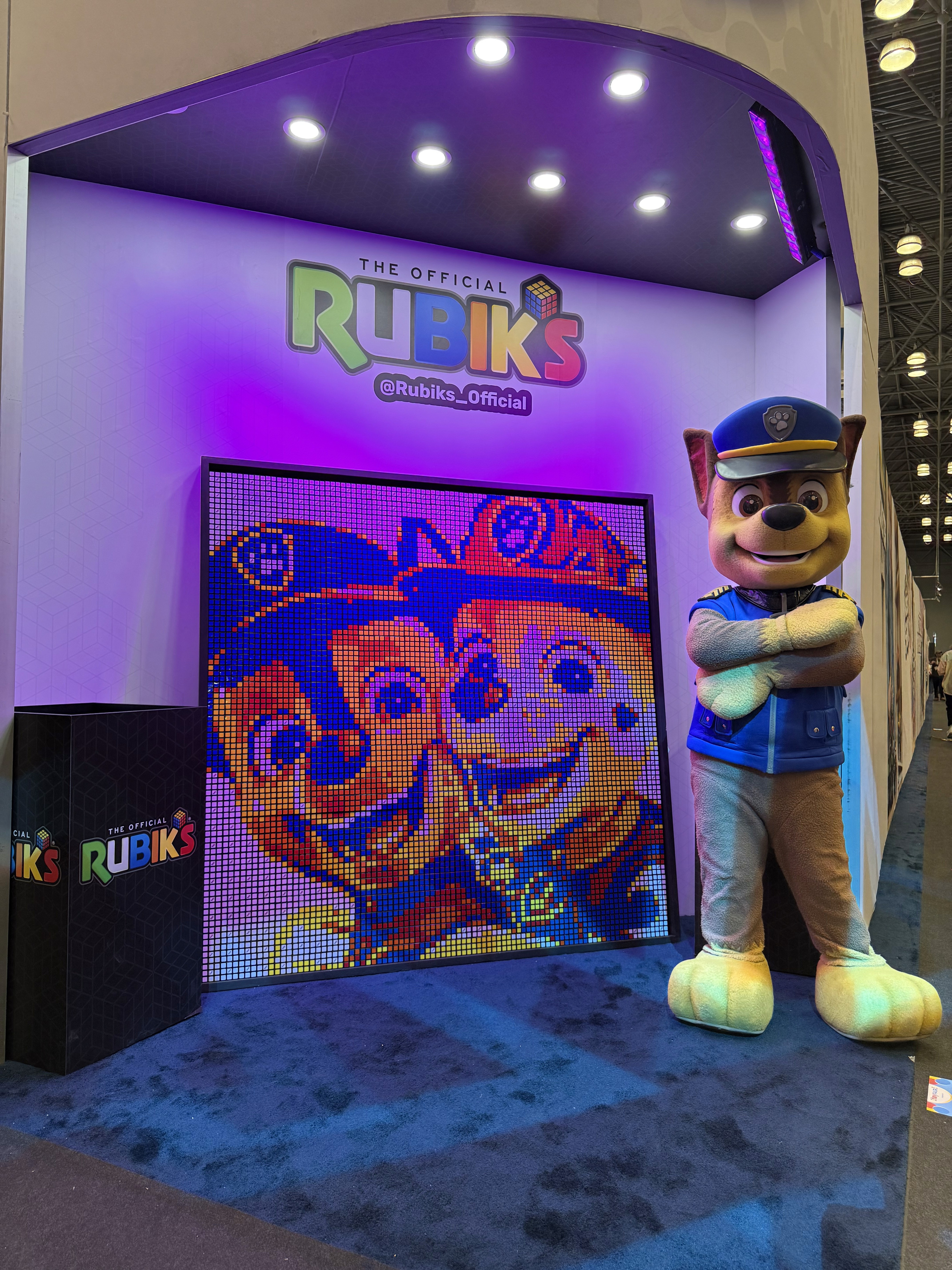 This cube mosaic of Chase and Marshall from PAW Patrol was built live during the 2025 NYC Toy Fair using 900 cubes, creating a fun and memorable experience for fans of all ages.
