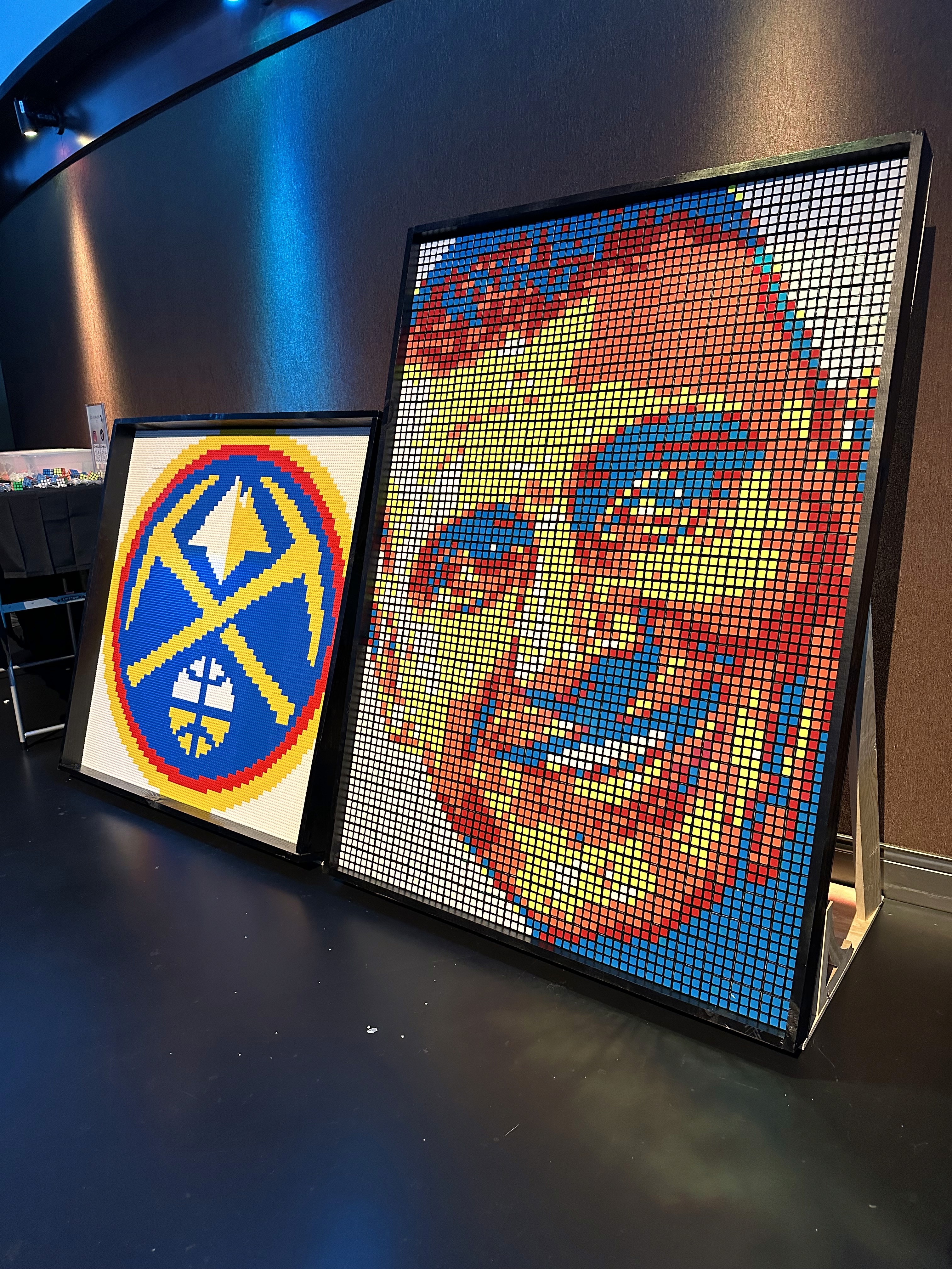 A dynamic duo of artworks created in collaboration with the Denver Nuggets, featuring a bold brick mosaic of the team’s logo paired with a striking cube mosaic portrait of Nikola Jokić, celebrating the heart and talent of the franchise.
